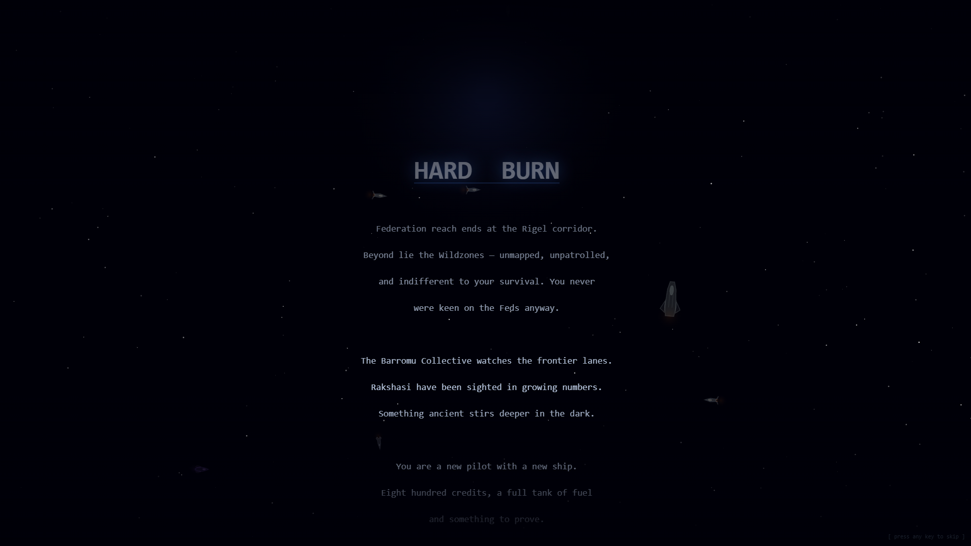 HARD BURN is a top-down space combat and exploration game inspired by the classic Escape Velocity series.... Pilot your ship through a hand-crafted galaxy of 25 star systems — from Federation-patrolled human space, through dangerous Barromu territory, across lawless wildzone frontier systems crawling with pirates and dreaded Rakshasi. Explore deep into the ancient reaches of forgotten space. Uncover the mysteries of the Great Collapse.